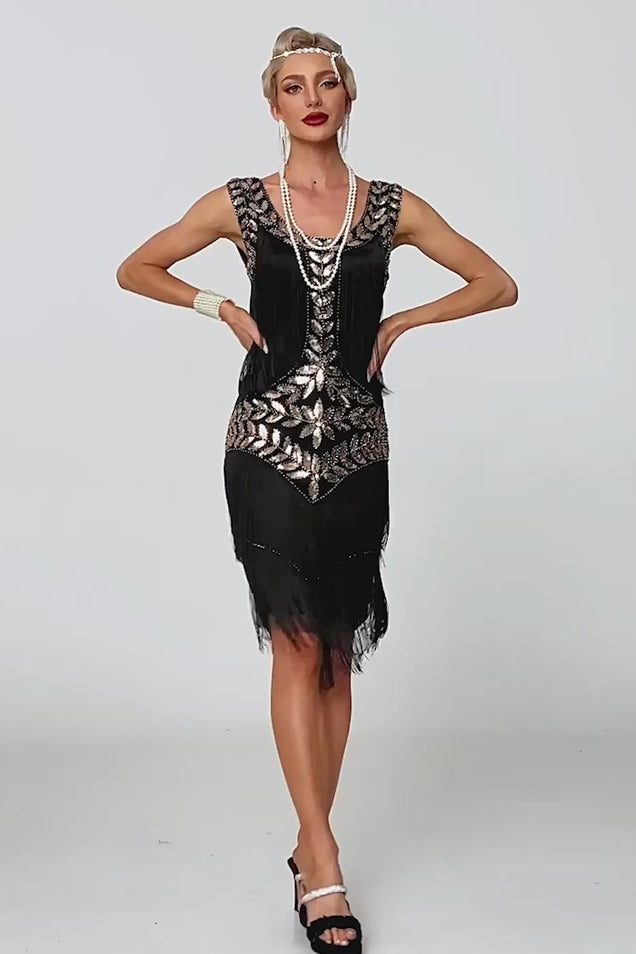 Champagne Gatsby Kleid aus den 1920er Jahren mit Pailletten und Fransen