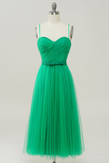 Grünes Tüll A-Linie Midi Ballkleid mit Rüschen